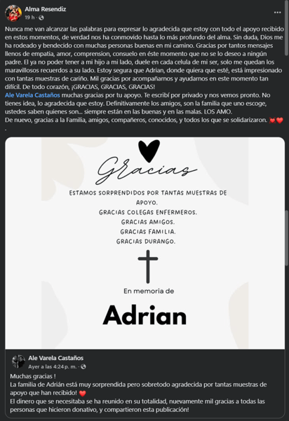 La mujer aseguraba que parte de su familia se encontraba haciendo algunas tareas o trabajos extras para recaudar los fondos necesarios, los cuales, y gracias al buen corazón de algunos duranguenses, fueron suficientes para recabar los 8,000 euros necesarios para pagar el traslado, documentos y el funeral de Adrian.