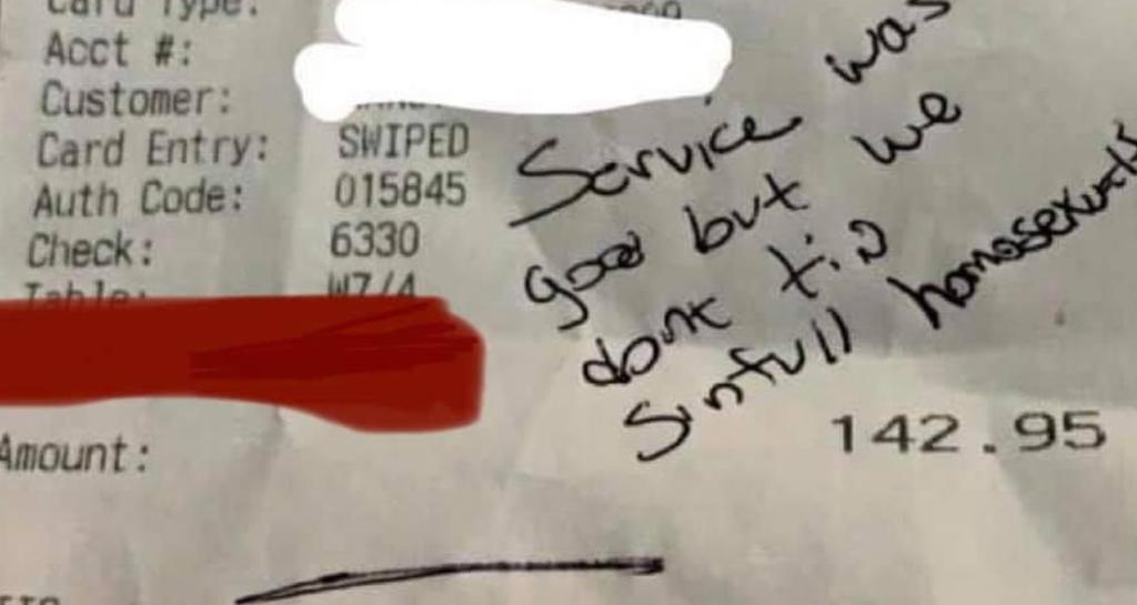 "El servicio fue bueno, pero no damos propina a los homosexuales pecadores", se lee en el ticket.