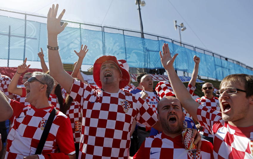 Aficionados croatas animan a su selección frente al estadio Arena Corinthians en Sao Paulo, Brasil, hoy, jueves 12 de junio de 2014. El partido inaugural del Mundial de fútbol de Brasil 2014, que enfrentará a Brasil contra Croacia, se disputará hoy en este estadio.
