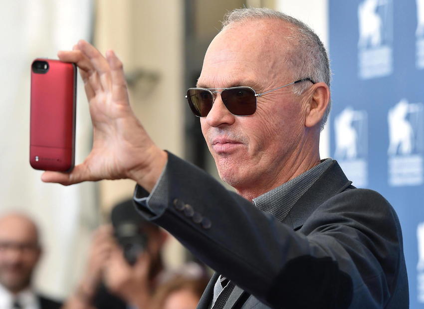 El actor estadounidense Michael Keaton toma una fotografía con su teléfono durante el pase gráfico de la nueva película de Iñárritu, "Birdman".