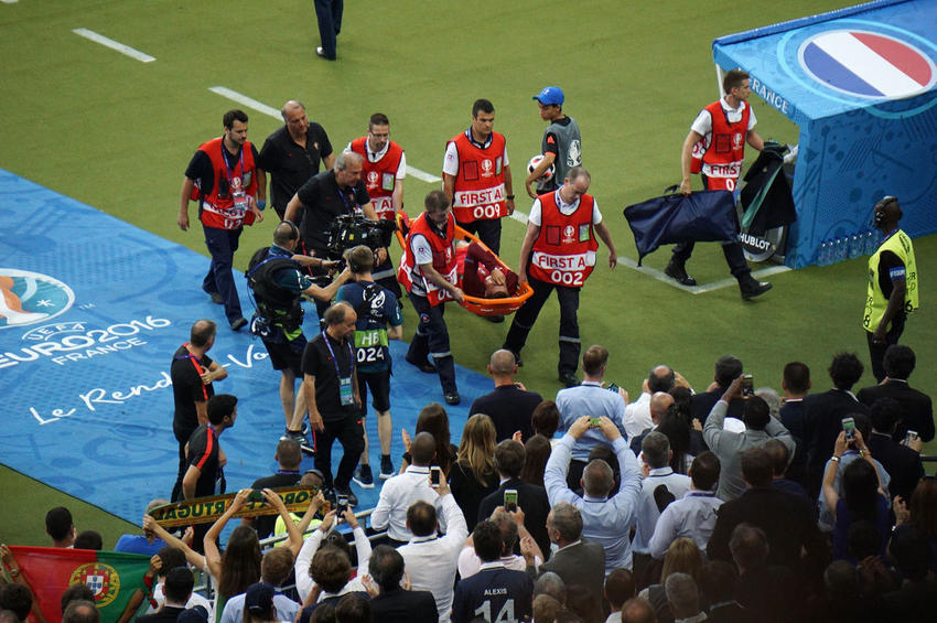 ...pero sus esfuerzos serían en vano y se vería obligado a abandonar el terreno de juego en camilla.Portugal conquistó su primer título de la Eurocopa al vencer 1-0 a la anfitriona Francia.
