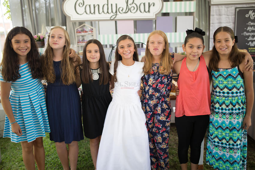 Valentina acompañada de sus amigas.Teniendo como marco la capilla del nuevo Santuario de Guadalupe, se llevó a cabo la Primera Comunión de la pequeña Valentina Ruiz Guerrero. La ceremonia religiosa que fue oficiada por el Pbro. Refugio López Muñoz, recibió a amigos y familiares que estuvieron presentes. Valentina llegó acompañada de sus papás, José Antonio Ruiz Garza y Paola Guerrero Velasco, así como por su hermanita, Romina Ruiz Guerrero. Como padrinos fungieron Juan Francisco Gutiérrez Fragoso y Vale Velasco Nájar, quienes se comprometieron a velar por el bienestar de su ahijada.