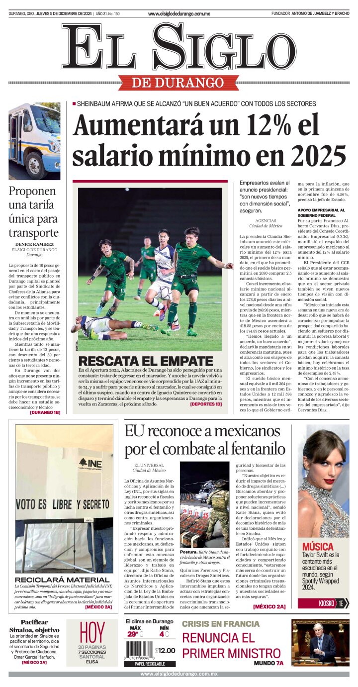 Edición impresa de El Siglo de Durango del jueves 5 de diciembre de 2024