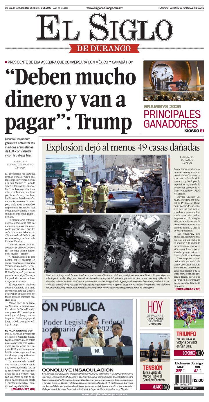 Edición impresa de El Siglo de Durango del lunes 3 de febrero de 2025
