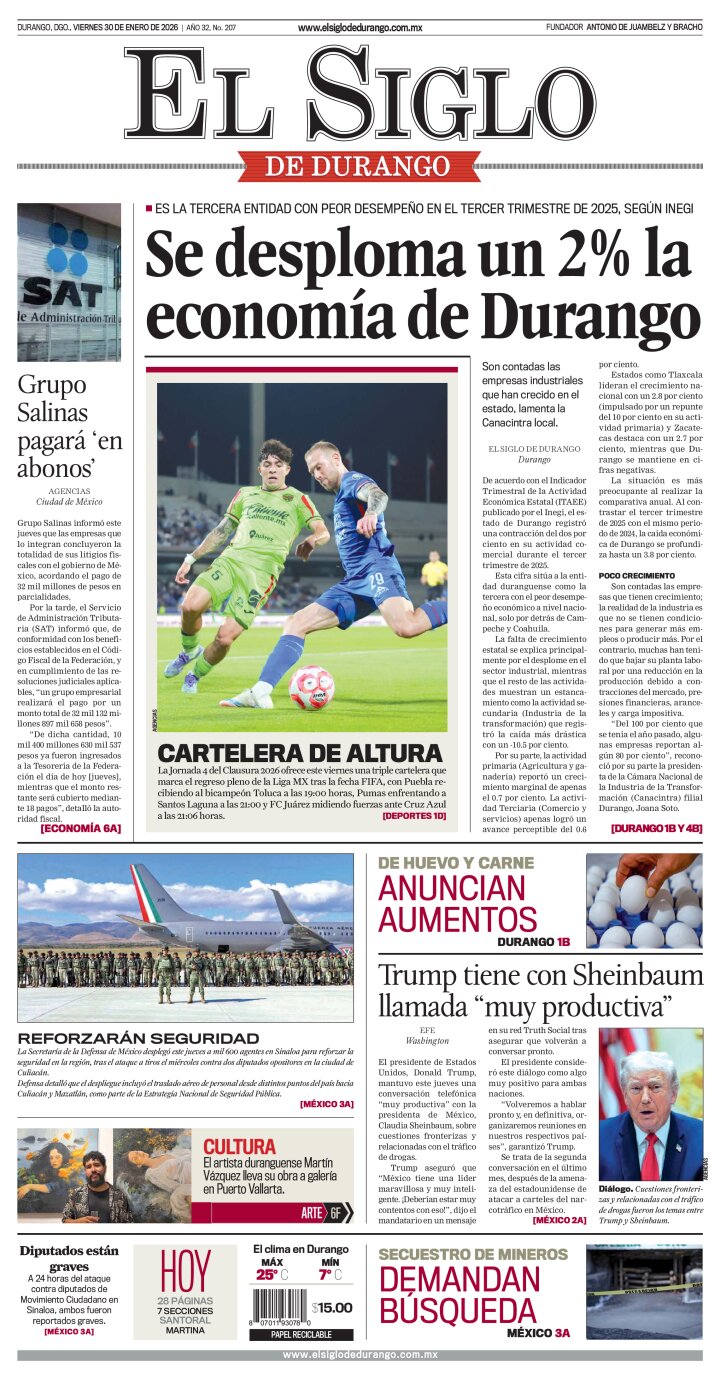 Edición impresa de El Siglo de Durango del viernes 30 de enero de 2026