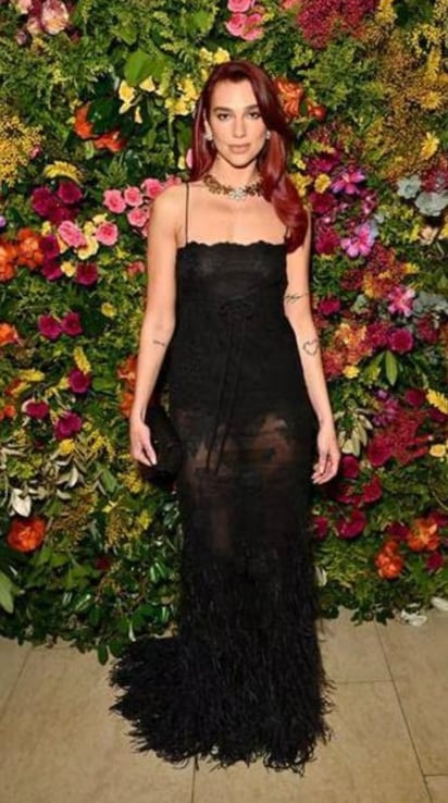 Unas horas más tarde, para el after party, Dua abandonó su vestido rojo de ensueño y apostó por un vestido más sensual de encaje negro con transparencias, también de la marca Valentino. El vestido tenía una terminación original con plumas. Para ese look, la cantante apostó por unos pendientes y collar dorado de gran tamaño de la joyería Tiffany & Co.