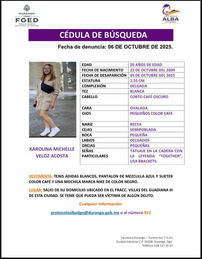 De acuerdo con la ficha de búsqueda, la joven Karolina Michelle Veloz Acosta, de 20 años de edad, estudiante de Diseño en la Universidad Tecnológica de Durango (UTD), fue vista por última vez este pasado lunes 6 de octubre cuando salió de su domicilio ubicado en el fraccionamiento Villas del Guadiana III, en la ciudad de Durango.