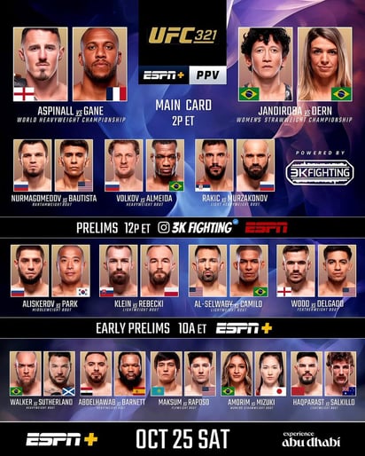 Este sábado 25 de octubre, la Etihad Arena de Abu Dhabi será el escenario de UFC 321, una velada que entrelaza coronaciones, revancha emocional y consolidación técnica. El evento estelar enfrenta al campeón interino Tom Aspinall contra el exmonarca Ciryl Gane, en una pelea que podría definir al peso pesado más dominante de la era post-Jon Jones. La cartelera incluye dos títulos en juego, presencia mexicana y el regreso de figuras como Umar Nurmagomedov y Alexander Volkov.