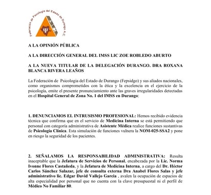 A través de un comunicado, la Federación de Psicología del Estado de Durango (Fepsidgo) denunció intrusismo profesional en el Hospital General de Zona No. 1, al señalar que cuenta con evidencia de que personal administrativo realiza funciones del área de Psicología Clínica.