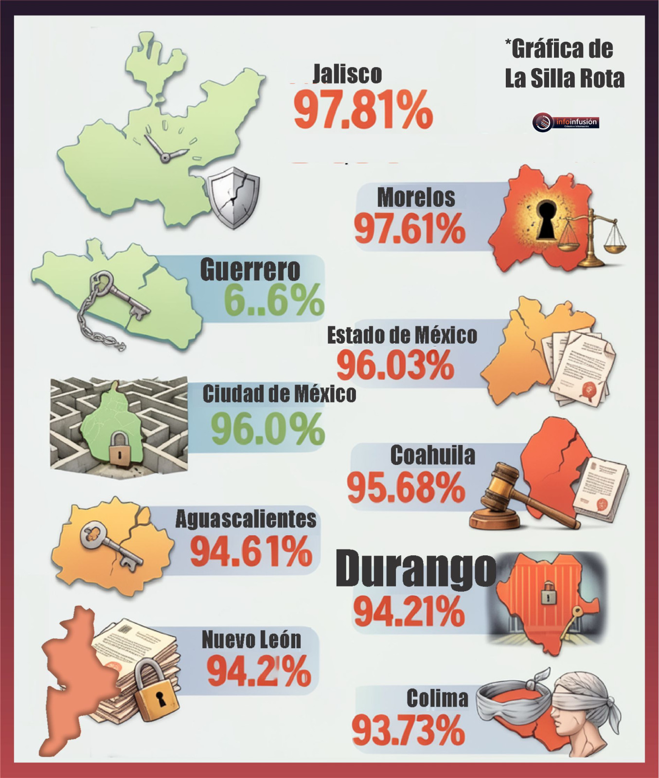 En el contexto nacional, entidades como Jalisco, México, Estado de México y la Ciudad de México encabezan los niveles más altos de impunidad, con índices que superan el 96 por ciento, debido principalmente al alto volumen de casos y la limitada capacidad de resolución.