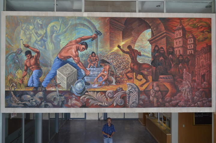 ‘Alegoría al trabajo, la lucha y las tradiciones de los hombres y mujeres de Durango’ es el título del mural que el artista Luis Gustavo Sandoval plasmó en la Facultad de Economía, Contaduría y Administración, perteneciente a la Universidad Juárez del Estado.