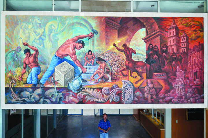 ‘Alegoría al trabajo, la lucha y las tradiciones de los hombres y mujeres de Durango’ es el título del mural que el artista Luis Gustavo Sandoval plasmó en la Facultad de Economía, Contaduría y Administración, perteneciente a la Universidad Juárez del Estado.