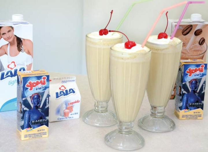 Se licúa la mitad de la Leche Lala y la mitad de Yomi Lala sabor vainilla congelado, se le agregan 3 plátanos y la crema de cacahuate.