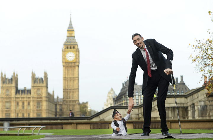Los plusmarquistas de estas asombrosas estaturas son: Sultan Kösen, un turco de 31 años que mide 2.51 metros, y Chandra Bahadur Dangi, un nepalí de 74 años que tan sólo mide 54.6 centímetros.