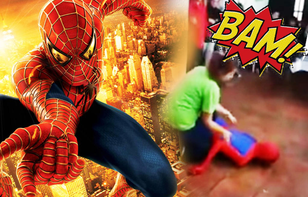 Los niños responden con risas, luego acuden uno de los adultos presentes se acerca para verificar que esté bien, sin embargo, Spiderman no se levanta.
