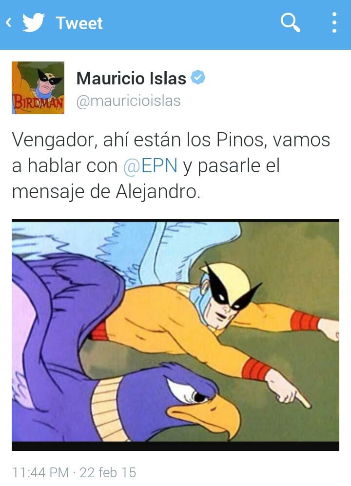 "Vengador, ahí están los Pinos, vamos a hablar con @EPN y pasarle el mensaje de Alejandro"; sostuvo Mauricio.
