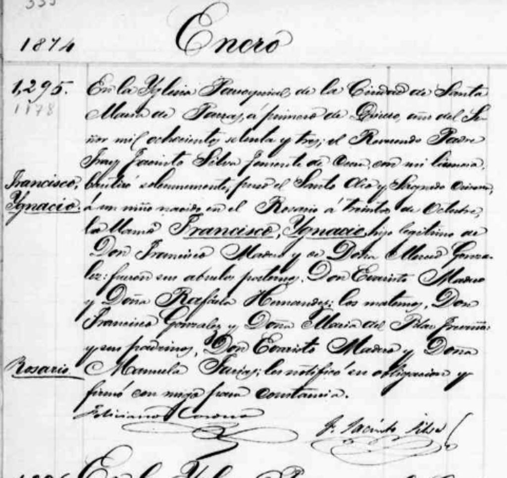 Por otra parte, el acta asentada adolece del error común que cometemos muchas personas, consistente en el que al hacer mención de alguna fecha del mes de enero, y sobre todo de los primeros días de ese mes, hacemos referencia al año inmediato anterior. Y en este caso no fue la excepción y así tenemos que don Francisco nació el 30 de octubre de 1873, y el registro de su bautismo se hizo el 1 de enero de 1873 sic; situación comprensible por lo anotado.