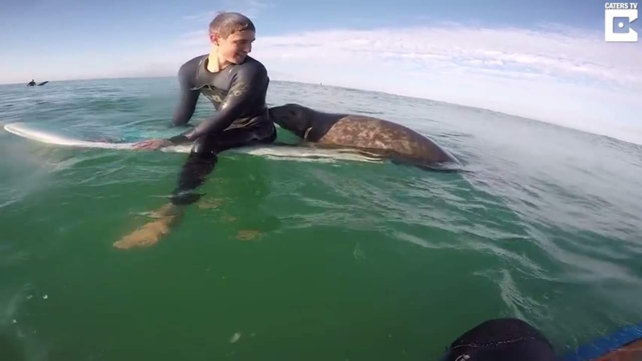 Yves Courtel, quien tomó el video, dice que comenzó a filmar cuando el animal se acercó a su amigo Romain mientras ellos se encontraban en el mar esperando las olas.