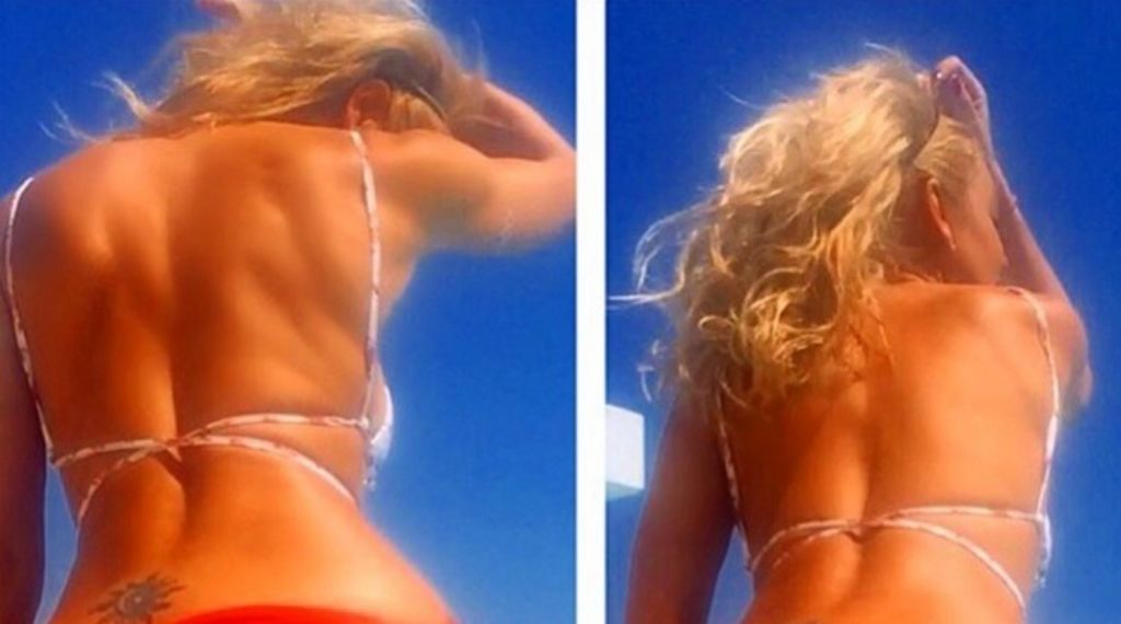 La modelo y cantante encendió una vez más a sus seguidores de Instagram tras postear una foto doble en la que aparece con un bikini rojo presumiendo su bien formada retaguardia.
