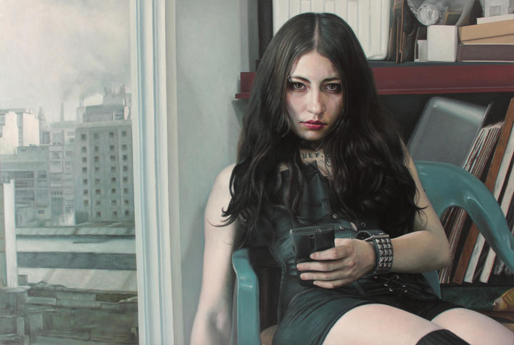 Así, en su obra empezó a aparecer un análisis sobre la manera en que las personas se relacionan con la tecnología. Pero ¿estos temas han modificado su forma de abordar una pintura? El pintor afirma: el motivo le sugiere la técnica. ‘Actualmente me he enfocado mucho en acabados que me permitan exaltar los materiales contemporáneos, como plásticos, metales y cristales, conviviendo con los personajes. Al mismo tiempo, el manejo del color se ha modificado nuevamente, haciéndose más neutro para acercarme a atmósferas sombrías y decadentes con tintes milenaristas’. Son estos rasgos los que aparecen en ‘Interior’, que busca ser ‘una metáfora de nosotros mismos’: ‘una sociedad alienada, agresiva, narcisista, hedonista, temerosa y, a pesar de todo, bella. La tecnología nos permite ‘estar y no ser’’.