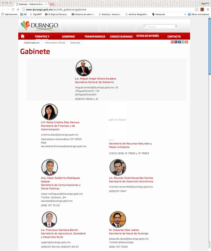 En el gabinete del Gobierno del Estado de Durango, conformado por 28 personas de acuerdo a los datos oficiales expuestos en su página web, únicamente figuran siete mujeres, quienes representan el 25 por ciento de los funcionarios de primer nivel en este orden de gobierno; únicamente una está al frente de una secretaría.
