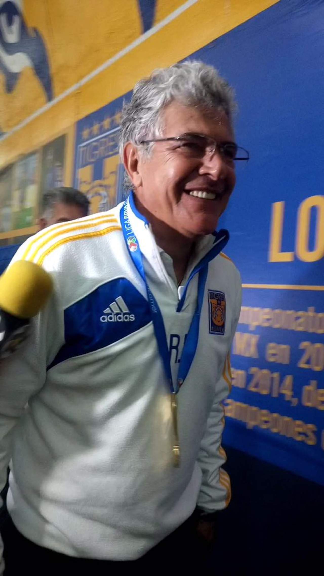 Con un semblante feliz después de haber derrotado al América en penales, el “Tuca” salió a festejar su cuarto trofeo de liga con Tigres, tras los obtenidos en el Apertura 2001, Apertura 2015 y Apertura 2016.