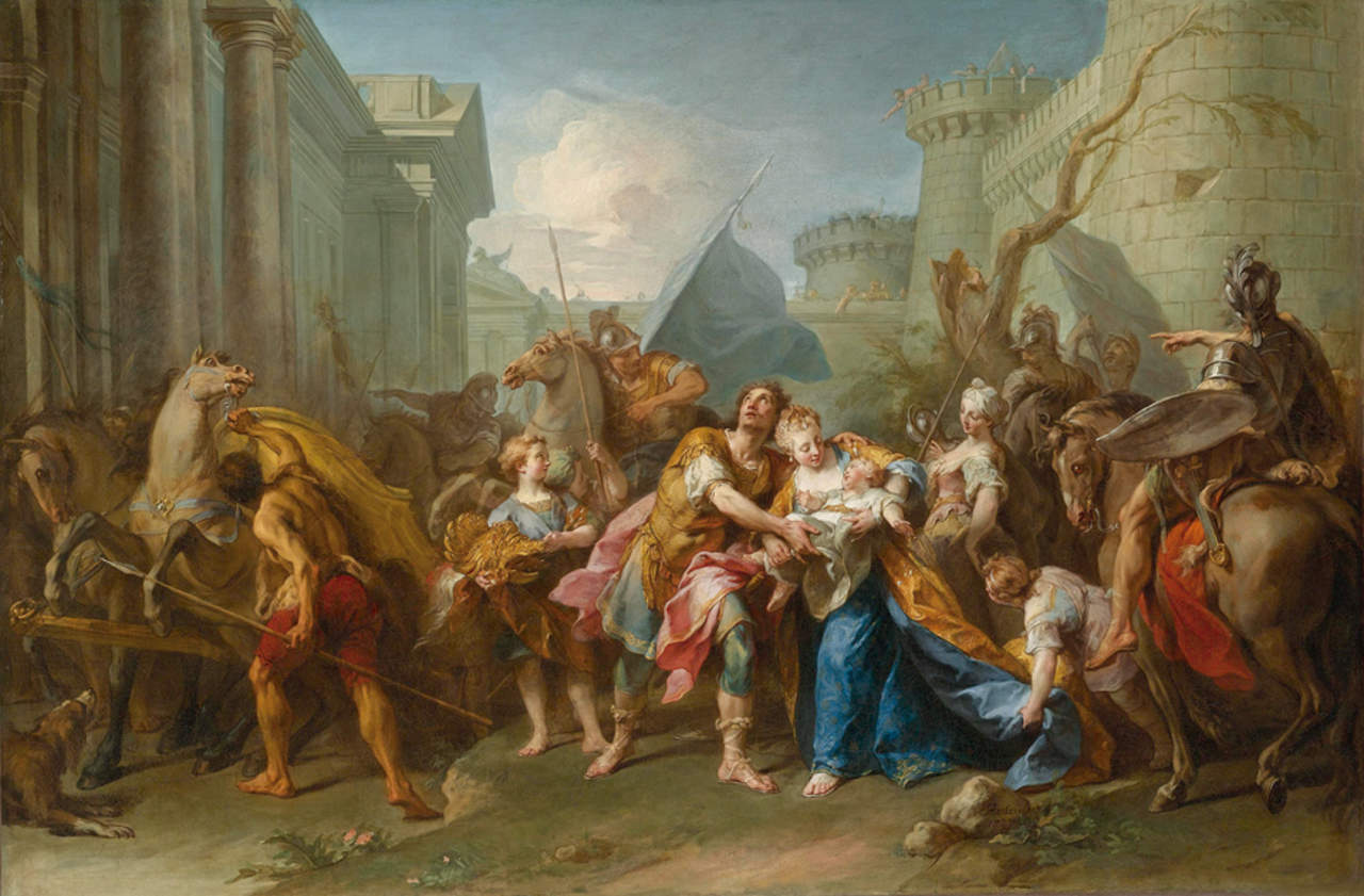 Para entrar de lleno en materia, sin embargo, se precisan los versos de una obra a la que ya se ha hecho alusión, la Eneida: “Por mil mares y tierras me llevaron; del presuntuoso Pirro (vástago de Aquiles) fui oprimida y a sufrir su soberbia me forzaron”.