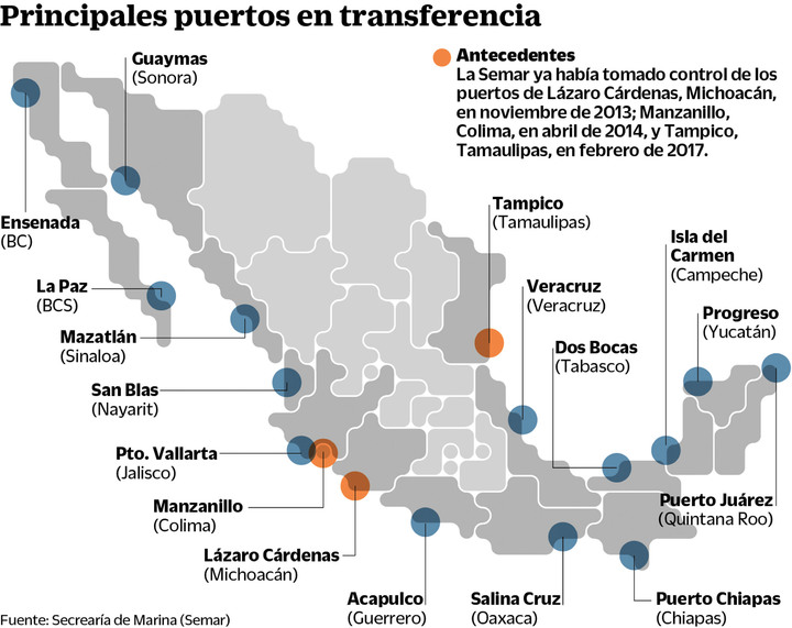 Debido a que los puertos mexicanos se convirtieron en un atractivo para actividades ilícitas, el próximo 17 de junio la Secretaría de Marina (Semar) tomará el control de las 103 capitanías de puerto que existen en el país. Lo hará en medio de señalamientos de que en 41 años a las áreas portuarias no se les invirtió ni un solo centavo y tampoco se fortaleció a las autoridades, las cuales además tenían un presupuesto reducido, trabajaban con personal insuficiente y con el equipamiento inadecuado.