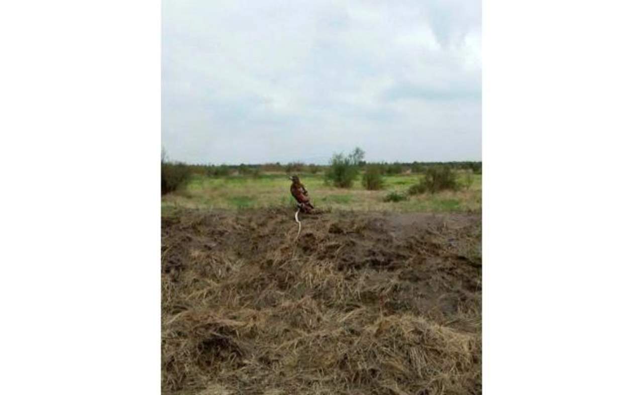 Una fotografía muestra a lo que puede ser un águila real parada en una amplia extensión de suelo rústico y sus patas pisan la cabeza del reptil ya muerto, momentos después de que se dio el combate mortal.