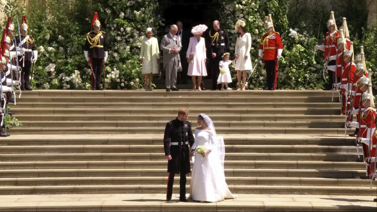 Con un vestido blanco y velo sujeto por una tiara de diamantes Markle bajó del automóvil, un Rolls-Royce Phantom IV, que la llevó hasta el templo, donde le esperaba su prometido, el príncipe Harry- nieto de la reina Ii de Inglaterra y sexto en la línea de sucesión al trono-, quien iba vestido con el uniforme del regimiento de caballería "Blues & Royals" de la Guardia Real.