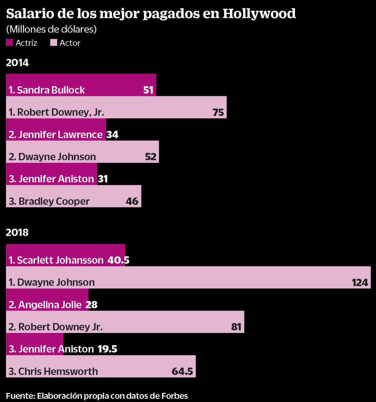 El listado de la revista Forbes de los últimos años sobre los actores mejor pagados de Hollywood muestra que, aún con la lucha emprendida por ellas, hoy ganan menos que en 2013 y, por lo tanto, sus ganancias no se comparan con las de ellos, y en los últimos dos años (justo cuando se ha hablado de igualdad salarial) la brecha ha crecido.