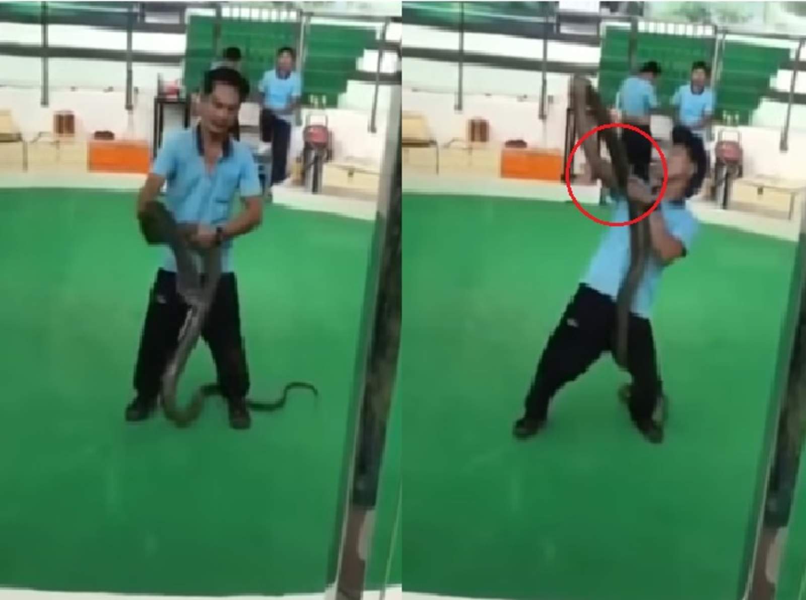 Según se aprecia en las imágenes, el hombre realizaba su actuación con la serpiente cuando ésta repentinamente clavó sus colmillos en el brazo de Yuttapong.