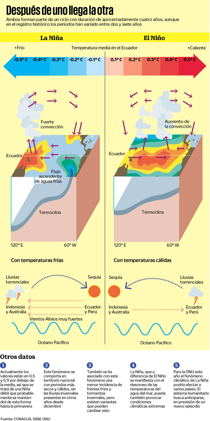 La Niña abraza en la actualidad a nuestro planeta. El maestro Martín Ibarra, Subgerente de Monitoreo Atmosférico Ambiental del Servicio Meteorológico Nacional (SMN) asegura que La Niña forma parte de un fenómeno más amplio conocido como El Niño-Oscilación del Sur (ENOS o ENSO, según sus siglas en inglés) que es un fenómeno que puede tener una periodicidad de entre dos y siete años. "Es un fenómeno climático que forman parte de las oscilaciones atmosféricas a nivel global, son patrones que se presentan en la Tierra de tres formas: El Niño, una fase neutra y La Niña".