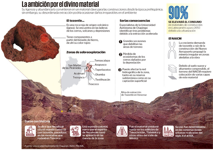 Precisamente el tezontle forma un papel muy importante en la construcción del Nuevo Aeropuerto. Durante meses los pobladores de la zona han visto desfilar a decenas de camiones cargando este material de minas cercanas, que según cifras oficiales no deberían sobrepasar 100 en un radio de 50 kilómetros, pero la demanda de material ocasionó que se hayan abierto muchas minas más ofreciendo material de construcción.