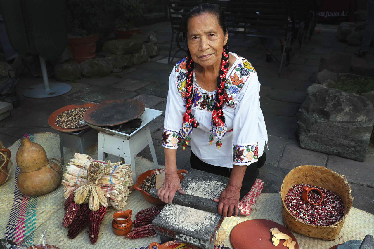 Herlinda Olivos pasa mucho tiempo hincada sobre los petates sin que el suelo la incomode. "Me acostumbré desde los seis años; antes de irme a la escuela pasaba a moler como cuatro kilos de nixtamal. Yo creo que por eso no me canso, ¡quién sabe!", dice mientras los adornos de chaquira de sus trenzas se balancean al triturar el pinole.