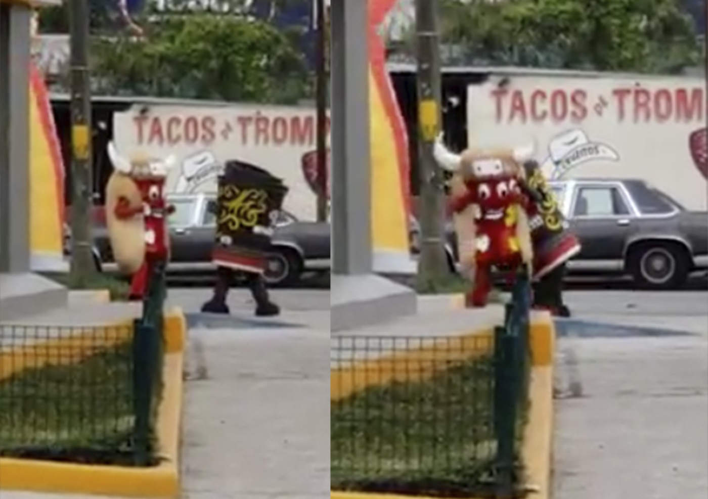 En las cómicas imágenes, aparece una botarga de un café 'Andatti' y la botarga de un hotdog 'vikingo', quienes se involucran en la intensa pelea.
