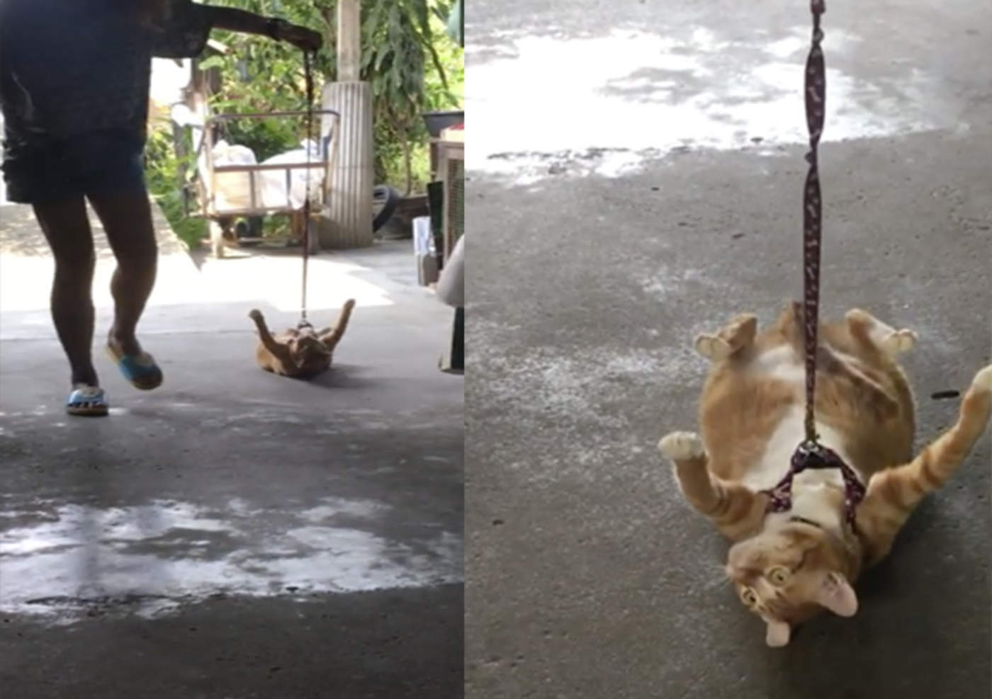 En Tailandia, una mujer captó el momento en el que su gato se rehusaba a caminar con la correa.