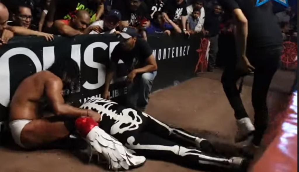 Durante una función de lucha libre en la ciudad de Monterrey, el luchador La Parka sufrió una caída que lo dejó inconsciente.