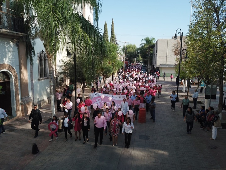 El Parque Victoria fue el punto de reunión para la Marcha por la Lucha en la Prevención contra el Cáncer de Mama, encabezada por el alcalde Homero Martínez Cabrera y Beatriz Galván Roque, titular del Instituto Municipal de la Mujer (IMM) que, alrededor de las 9:00 horas de este viernes, recorrieron el trayecto de la avenida Sarabia hasta llegar a la Plaza de Armas, frente al Palacio Municipal, alcanzando un contingente superior a las 300 personas.