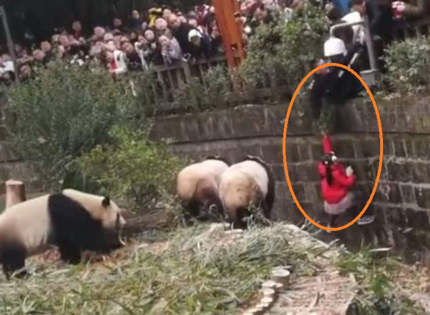 Un niña de aproximadamente cinco años resbaló y cayó dentro del hábitat de unos pandas en una reserva natural en China.