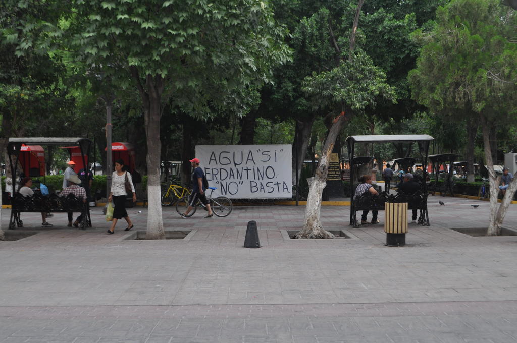 "Agua sí, Lerdantino no, basta", escribió Aurelio Hinojosa Morales, bolero de la plaza, frente a la presidencia municipal de la Ciudad Jardín.