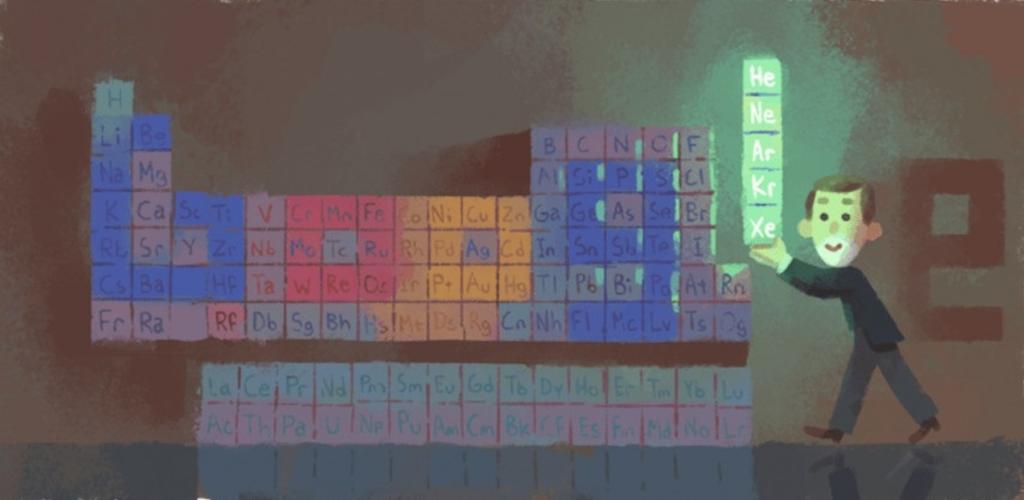 El doodle que comparte hoy Google muestra al químico sosteniendo los elementos del grupo de gases nobles mientras los coloca en la tabla periódica.