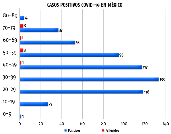 México registra ya 8 muertes provocadas por el COVID-19, así como 585 casos positivos, cuatro de ellos asintomáticos, y 2,156 sospechosos. Esto significa que en las últimas 24 horas se sumaron 110 casos positivos y 500 casos sospechosos. La Secretaría de Salud informó que los grupo de edad en los que se han presentado más casos es el de 30 a 34 años, y en el de mayores de 65 años.