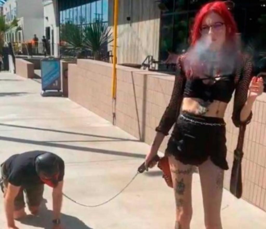 Dominatrix se vuelve viral por pasear a un hombre con correa en EUA