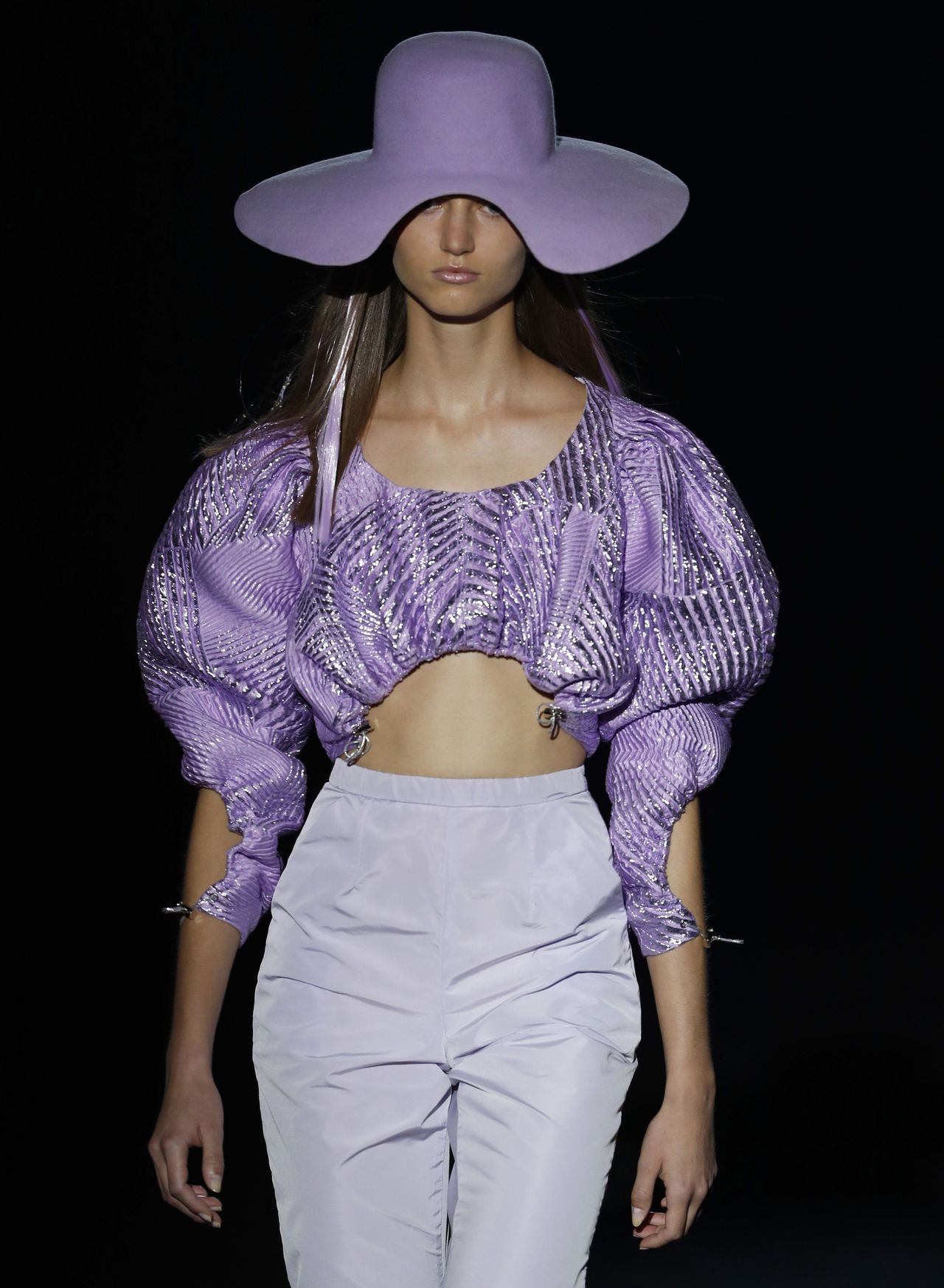En esta ocasión, los volúmenes y los tejidos del tul brillante metalizados tan característicos de la marca han sido sustituidos por materiales como el lamé, el crepe elástico o la lycra con la que confecciona potentes bodies con efecto segunda piel. "Es la pieza estrella para la noche, ojalá se vea sobre el escenario de muchas divas de la música".