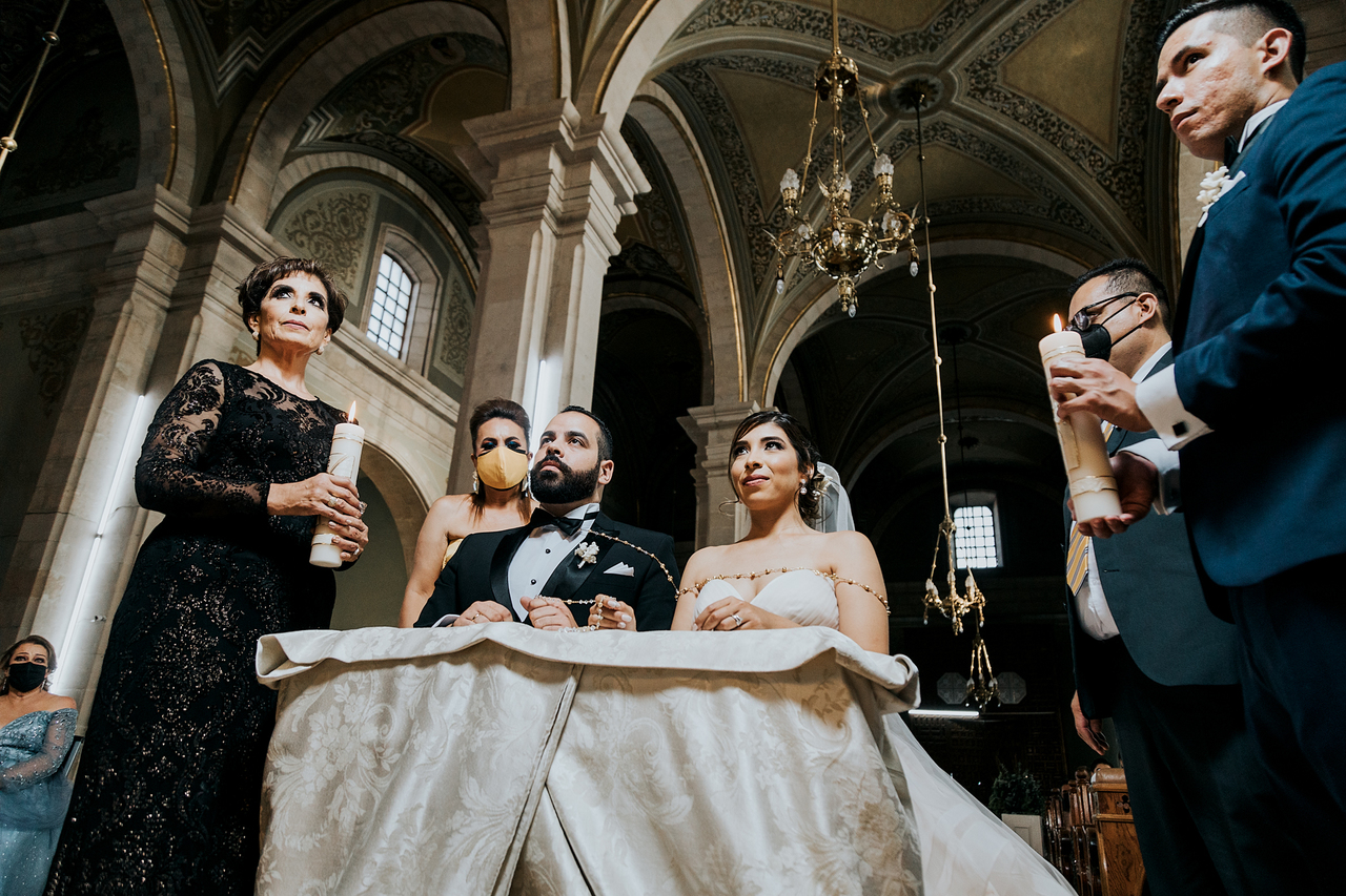 Durante la ceremonia religiosa el sacerdote explicó a los novios la importancia de este sacramento del matrimonio, aunado a ello, tomó el consentimiento a los contrayentes para así quedar unidos delante de Dios como marido y mujer.