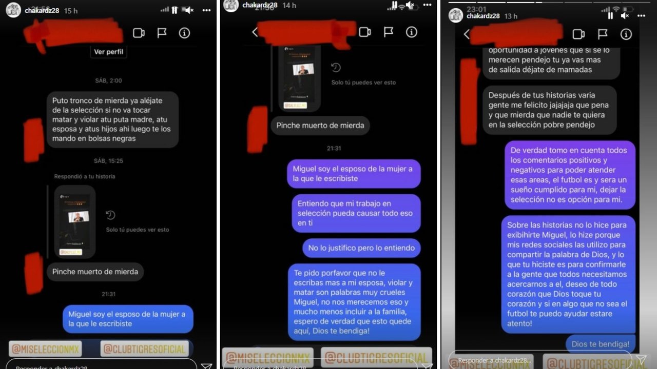 "Miguel soy el esposo de la mujer a la que le escribiste. Entiendo que mi trabajo en la Selección pueda causar todo eso en ti, no lo justifico, pero lo entiendo. Te pido por favor que no le escribas a mi esposa, violar y matar son palabras muy crueles Miguel, no nos merecemos eso y mucho menos incluir a mi familia, espero de verdad que esto quede aquí. ¡Dios te bendiga!".