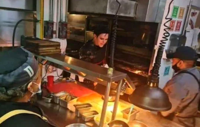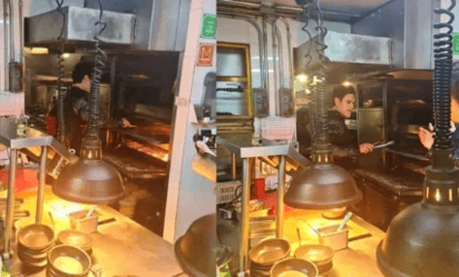 En las imágenes se puede ver al músico, con la misma ropa con la que visto en el centro histórico, y metido hasta la cocina del local, incluso sostiene unas pinzas con las que parecer sacar algún alimento de un enorme horno.