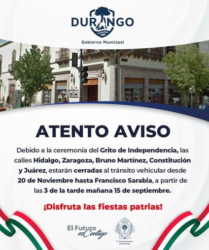 En un comunicado oficial, se informó que las vialidades del Centro Histórico de Durango que se mantendrán sin paso vehicular serán las calles Hidalgo, Zaragoza, Bruno Martínez, Constitución y Juárez, desde avenida 20 de Noviembre hasta las Alamedas.