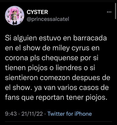 "Si alguien estuvo en barricada en el show de Miley Cyrus en Corona pls chéquense por si tienen piojos o liendres o si sintieron comezón después del show. Ya van varios casos de fans que reportan tener piojos", escribió una usuaria en Twitter.